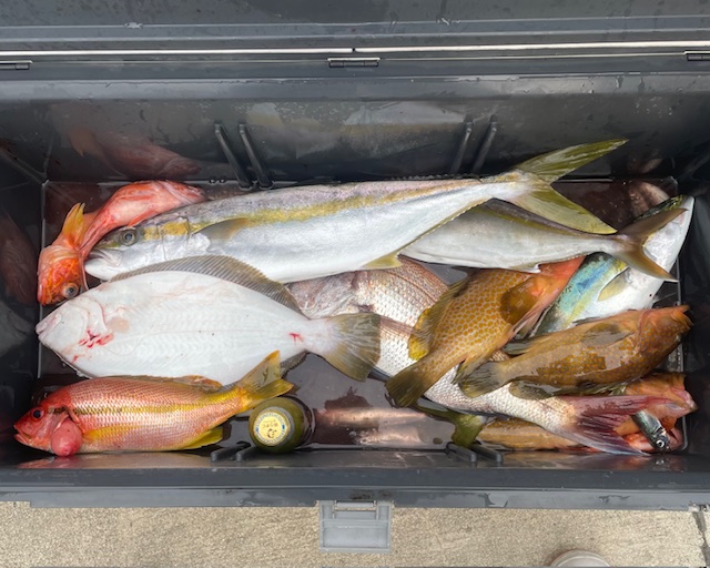 今日の落し込み非常に厳しいく釣果に偏りが出てました 釣られ方でカンパチ3匹 ヒラス1匹 良型のキジハタ2匹