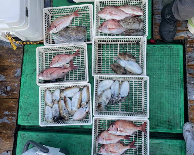 真鯛 甲イカのリレー釣りでした 竿頭の方真鯛3匹 甲イカ10匹でした